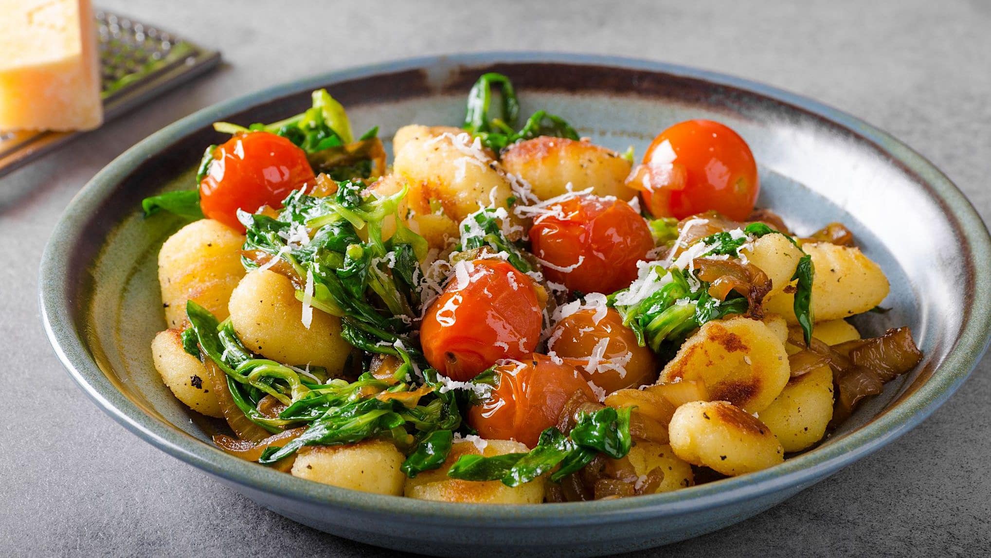 Cette recette végétarienne généreuse marie les gnocchis moelleux avec des légumes verts nutritifs et des tomates sucrées. Le parmesan ajoute une finale crémeuse à ce plat qui plaira à toute la famille.