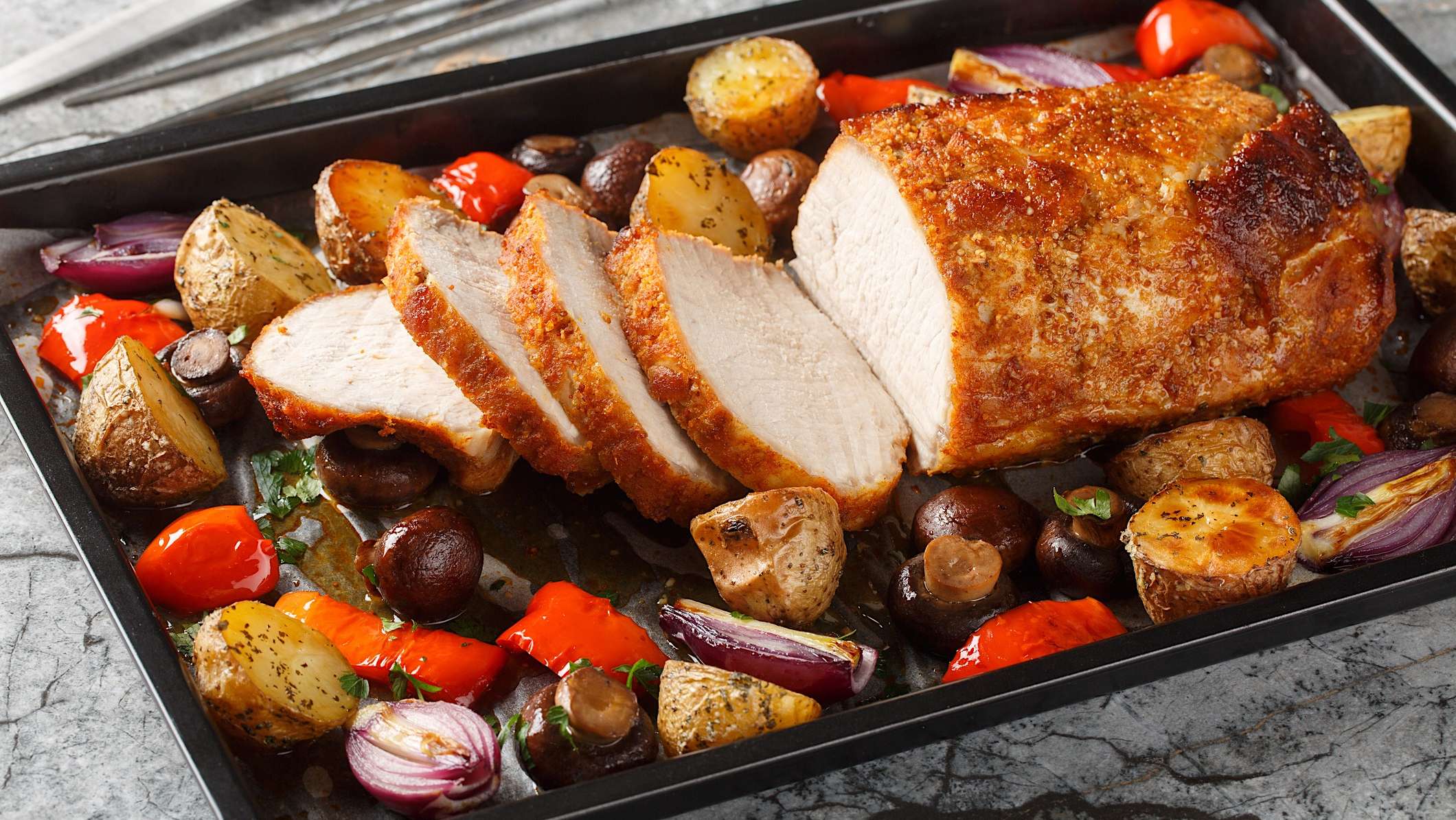 Longe de porc aux légumes rôtis à la plaque