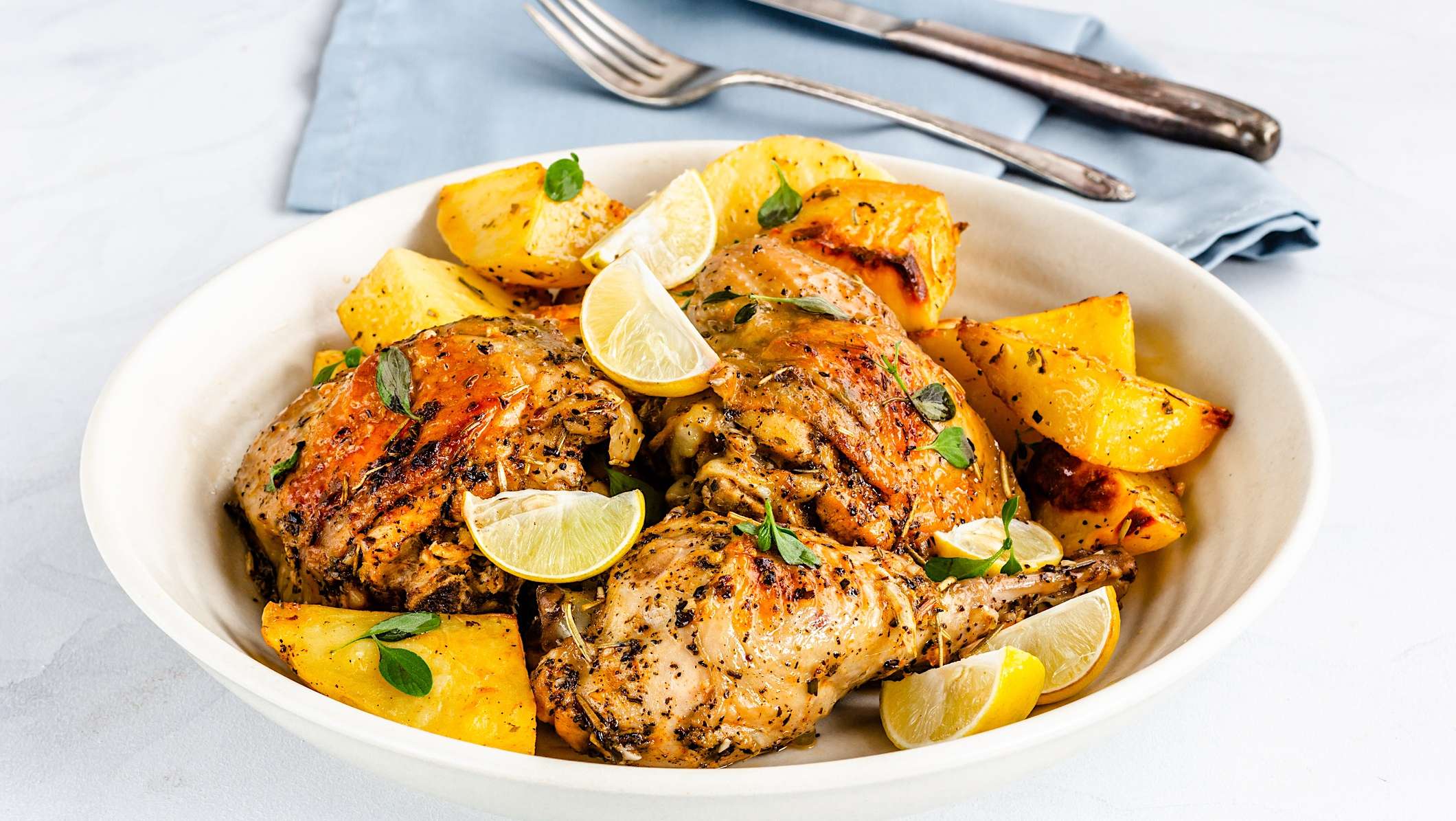 Faites rôtir pendant 50-60 minutes, jusqu’à ce que les pommes de terre soient tendres et que le poulet soit doré et bien cuit. Transférez les pommes de terre et le poulet dans un plat de service.